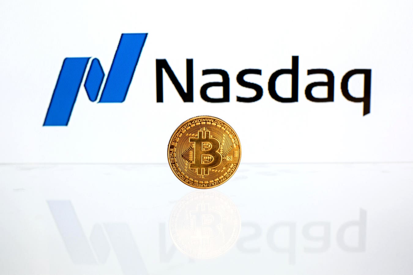 Photos of Nasdaq and Obos Bitcoin.